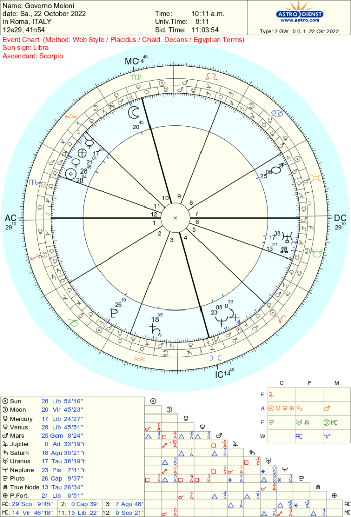 Alle 10:00 giura la Meloni. Marte stazionario prossimo alla retrogradazione è Maestro d’Ascendente, e lancia il trigono a Mercurio che andrà a perfezione il 27-10. Mercurio però produce prima il trigono con Saturno il 23-10, quindi porterà la luce di Saturno a Marte, il quale trigonerà Saturno in data 28-11. Stellium in Casa XI, luogo astrologico molto legato alle istituzioni, dove troviamo Venere Cazimi prossima alla congiunzione superiore che avverrà in serata. Ancora in serata, la Luna va a quadrare il Maestro d’Ascendente.