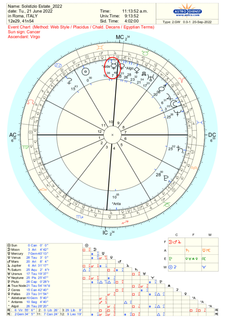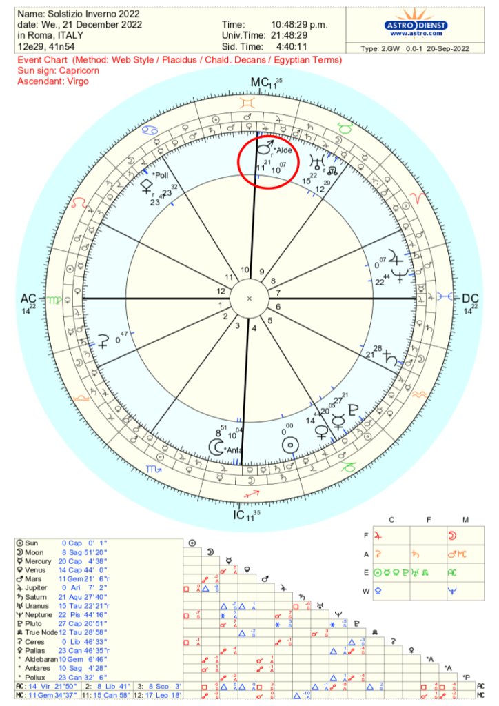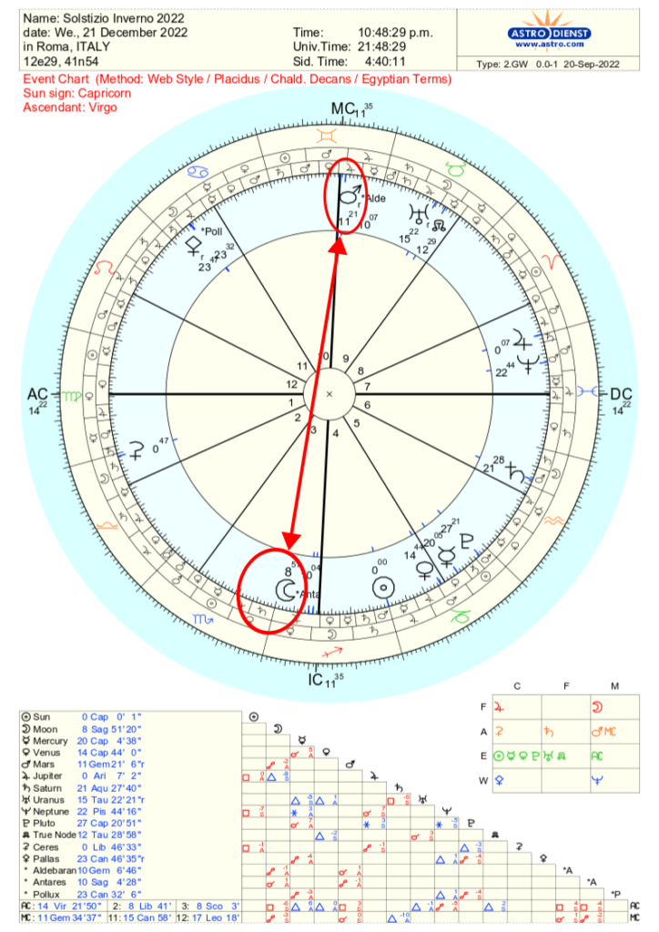 La prima cosa che salta all’occhio in questa carta italiana, eretta per Roma, la Capitale di quello che resta di questa Italia, è quel brutale Marte, altissimo al Medio Cielo del quale abbiamo già fatto accenno qui, e qui e del quale andiamo ad approfondire. Quel Marte è la chiave di lettura di questo Cielo e di conseguenza di questa ferale stagione. Cosa sta succedendo? Cosa ci sta succedendo? Quale Dio ci ha stregati? Perché sono ormai due anni suonati che viviamo in questa sorta di ipnosi collettiva…
