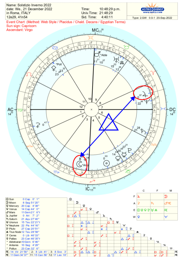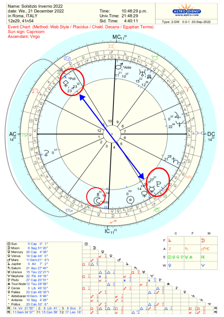 Quindi, Cerere, l’asteroide ex pianeta che simboleggia le derrate alimentari, il grano in ogni sua forma lessicale e per estensione la grana, sul grado dove nel precedente Equinozio d’Autunno si congiungevano il Sole con un Mercurio retrogrado e combusto, si oppone adesso a un Giove in Ariete, segno belligerante. Ora, Cerere come nutrimento e Giove come gas, essendo il pianeta stesso composto principalmente di gas… e siamo liberi di congetturare. O saranno proprio i prezzi degli approvvigionamenti e le salatissime bollette a fare da innesco al detonatore di questa bomba civile che ci sta per scoppiare in casa? Fame e Freddo. È in questo modo che iniziano le guerre civili, ed è sempre in questo modo che i regimi le organizzano e si tolgono le cosiddette castagne dal fuoco. Stiamo in campana.