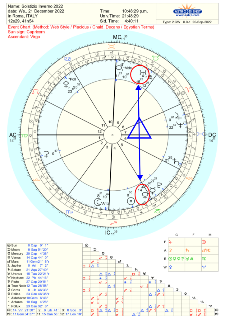 Nel Solstizio d’Inverno dello stesso anno, il 2020, il rosso malefico lo troviamo coinvolto in una terrificante ed esattissima quadratura con il Signore dell’Ade in persona, dal 23° grado di Ariete al 23° grado del Capro, ed è quello stesso mefitico e demoniaco Plutone ad imporre la Decima1, a condurre la sua macabra e manipolatoria danza. Sembra ieri, che siamo scesi all’Inferno. Non lo dimenticheremo mai.