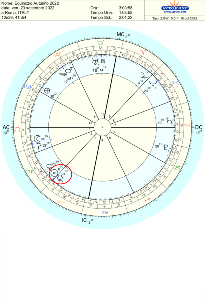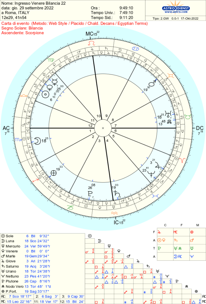 Astrologicamente, questo accade a causa, paradossalmente, dell’ingresso di Venere nel suo segno, la Bilancia. Venere si trova ad attraversare la fascia umbratile (da 25° Vergine a 9° Bilancia) relativa alla retrogradazione di Mercurio, con il quale ha da poco (26 settembre, la vittoria della Meloni) fatto la congiunzione, e quando entra in Bilancia (29 settembre), si pone su quel grado esatto su cui è avvenuta la congiunzione inferiore di Mercurio con il Sole (Sole=maschile) nel giorno esatto dell’equinozio (23 settembre), e per questo motivo questo grado è particolarmente importante: tutti gli aspetti partili ed in particolar modo le congiunzioni che si producono nei cieli cardinali o tropici, ovvero relativi a solstizi ed equinozi, sono particolarmente rilevanti.