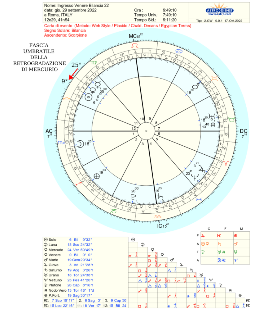 Va considerato anche che Mercurio che torna diretto il 2 ottobre, non produce il suo bene dal giorno stesso del cambio di direzione, ma bisognerà per questo attendere, uno, che riacquisti la sua velocità di crociera, e due, che attraversi tutta la fascia umbratile fino al 9° Bilancia in data 17 ottobre, di modo da portare a sviluppo o a elargizione tutti gli aspetti che ha promesso durante la retrogradazione. E la stessa cosa vale per Venere e per il Sole che durante la fase di retrogradazione di Mercurio si sono a lui congiunti, quindi il Sole esce dalla fascia umbratile il 2 ottobre e Venere il 5, (Queste due date non significano accadimenti ma sono le date conclusive di un movimento ciclico). Lo stesso ragionamento lo si può fare per qualsiasi altro aspetto prodotto dal pianeta durante la retrogradazione.