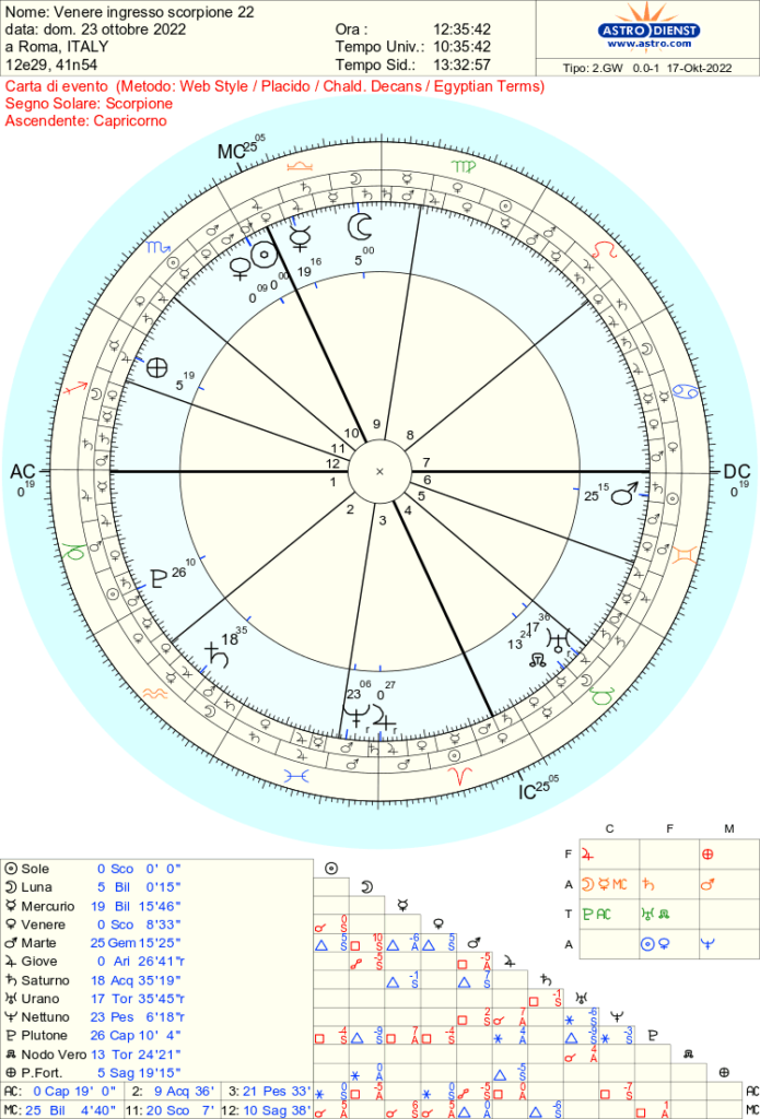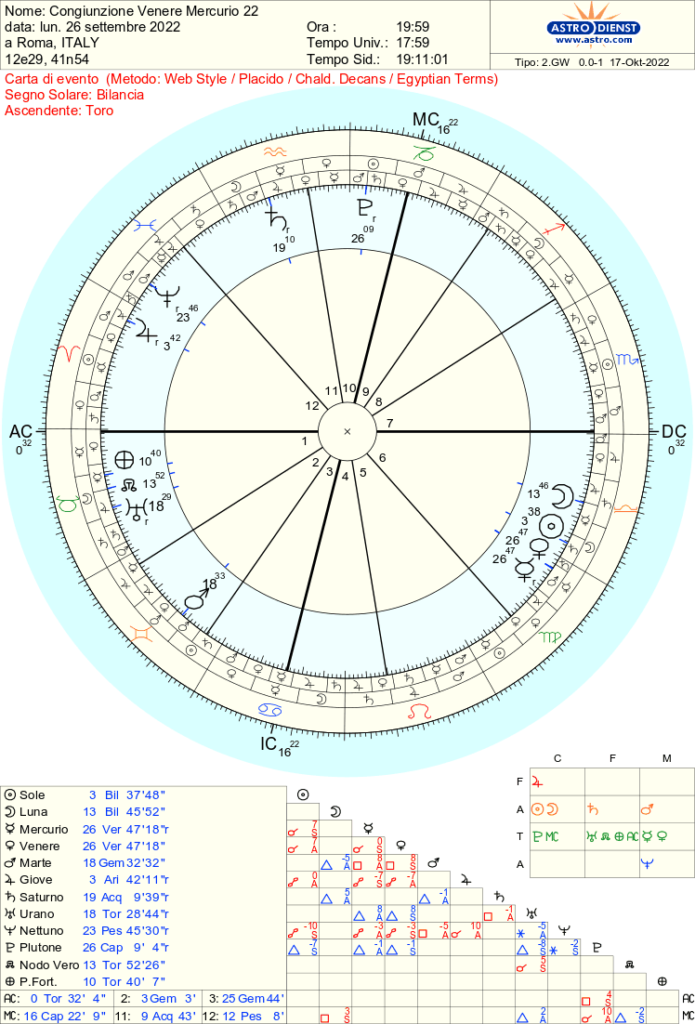 Ancora, in questi ultimi tempi abbiamo assistito alla mutua ricezione di Venere con Mercurio, dove avevamo Venere in Vergine e Mercurio in Bilancia, un periodo nel quale i due si sono scambiati i domicili,e per questo si sono scambiatidelle significanze, dei contenuti, dove Venere ha per così dire accolto alcune delle significanze di Mercurio, le quali come abbiamo appena visto erano già fortemente marziali, e le consegne sono avvenute in data 26 settembre, quando viene annunciata (Mercurio) la vittoria della Meloni (Venere) all’esatto momento della congiunzione tra questi due pianeti interni, Venere e Mercurio, dove Mercurio andava incontro a Venere per retrogradazione trasponendo la luce del Sole con il quale si era congiunto in precedenza e di Marte suo ospite in Gemelli, e consegnando il pacchetto completo a Venere per traslazione di luce. Quindi, questo Mercurio fortemente maschilizzato, fortemente solare e marziale, che si consegna a Venere. La traslazione di luce consiste nel fatto che un pianeta, applicandosi ad un altro, consegna a questo i significati (o la luce) dell’ultimo aspetto compiuto con un qualsiasi altro pianeta. E allora, quando finalmente Venere si trova ad entrare nel suo segno, ecco che non troviamo una Venere totalmente femminile, anzi!