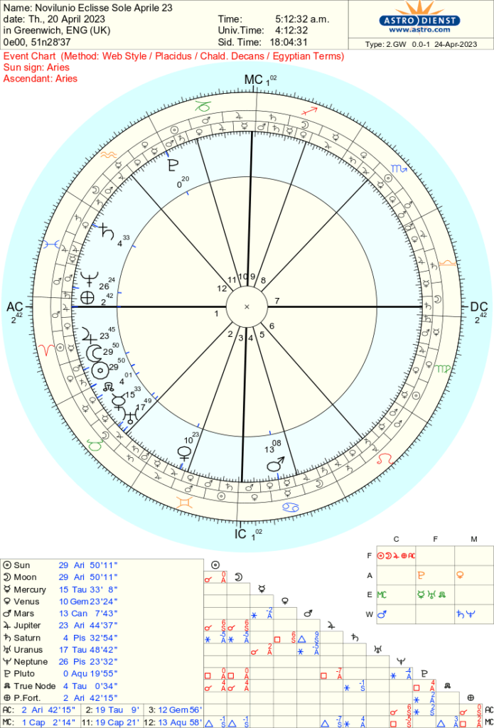 E adesso andiamo ad allargare i giochi all’interpretazione del mese lunare a venire, ovvero alla seconda Luna Nuova della stagione primaverile del 2023, la quale, e questa è una singolarità, cade nuovamente in Ariete come la precedente. Questa carta presenta diverse peculiarità, la prima consiste ovviamente nell’eclissi, la seconda, lo ripetiamo, è che si colloca nuovamente nel segno Cardinale di Ariete invece di cadere nel segno fisso del Toro, una terza è che il Sole farà il suo ingresso in Toro appena quattro ore dopo, e ancora una quarta, che la lunazione avviene praticamente all’alba o appena prima. Un cielo astrologicamente spettacolare. Fuochi, Ariete, d’artificio, Giove.